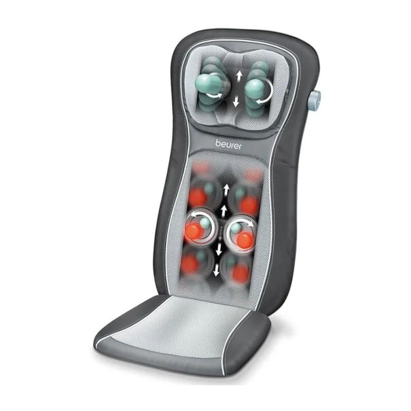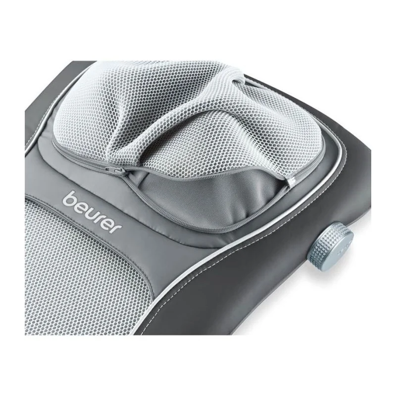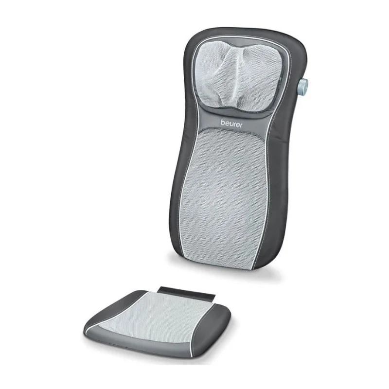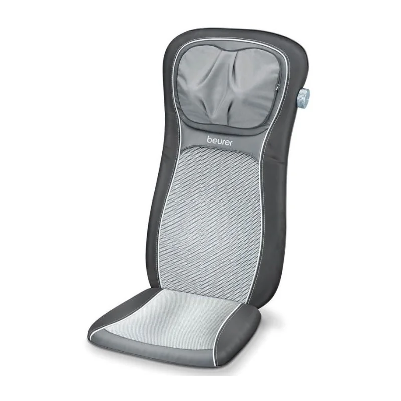 Housse De Siege Vibrante BEURER SHIATSU - Puissance: 19 Watts - Nombre de têtes de massage: 4 - 2 vitesses - Housse: Maille + velours - Matière: Aspect cuir - Fonction minuteur: 5/10/15 minutes - Massage ponctuel - Massage roulant bien-être - Fonction lumière et chauffage désactivable - 2 doigts de massage shiatsu rotatifs pour la nuque - Mouvement le long de la colonne vertébrale - 3 zones de massage sélectionnables individuellement - Bande de fixation auto-agrippante - Dimensions: 152 x 72 cm - Couleur: Noir & Gris - Garantie: 3 ans
