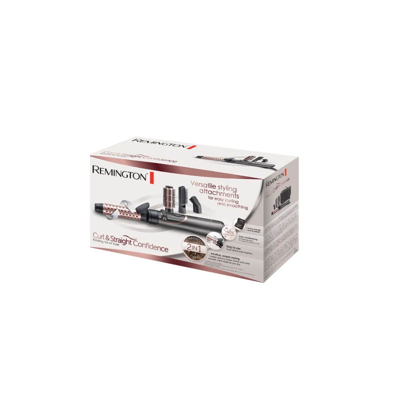 La brosse soufflante rotative Remington Curl & Straight Confidence est l'outil idéal pour réaliser brushing, lissage ou boucles avec un seul appareil. Cet équipement de coiffage est livré avec un ensemble d'accessoires spécialisés qui vous permettent de sécher et de coiffer vos cheveux simultanément.