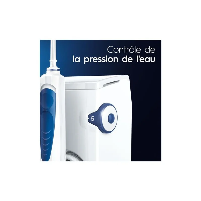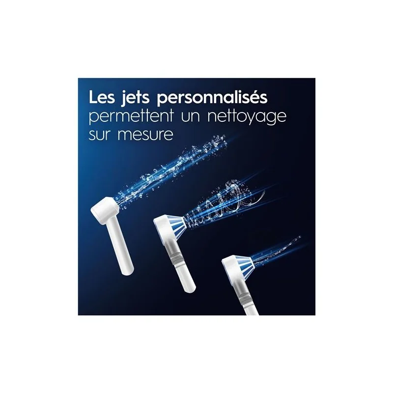 Waterjet Oral-B (Irrigation Buccale) : Appareil d'irrigation buccale polyvalent, offrant un nettoyage interdentaire et un soin en douceur des gencives grâce à un jet d'eau puissant et des réglages de pression ajustables, le tout avec la praticité d'un réservoir amovible de grande capacité.