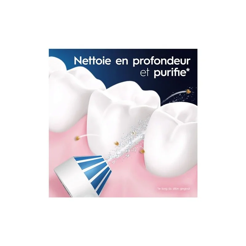 Concernant le Waterjet Oral-B, remplissez le réservoir d'eau tiède (avec ou sans rince-bouche), ajustez la pression, puis activez l'appareil pour irriguer doucement les espaces entre vos dents et le long des gencives, en ciblant les zones à résidus.