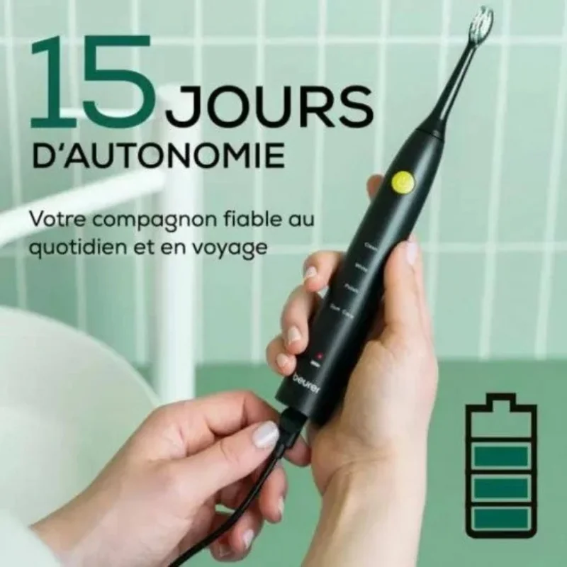 BEURER SC 30 Jet Black GP Brosse a Dents Electriqueoffre 80 000 oscillations/min pour un brossage complet et doux. Ses 4 programmes de brossage vous permettent d'adapter votre hygiène bucco-dentaire à vos besoins, tandis que le minuteur acoustique vous aide à nettoyer parfaitement toutes les zones de la bouche. Son corps est fabriqué à partir de matériaux 100 % recyclés et ses poils de tête de brosse sont fabriqués à partir de matériaux 100 % renouvelables : conçus pour vous et dans le respect de l'environnement.