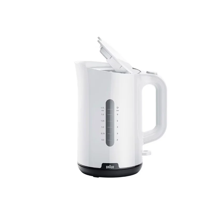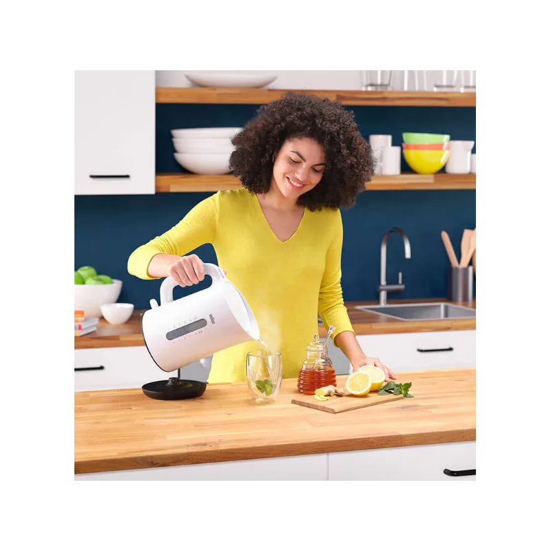 Remplissage facile - Couvercle rabattable - Base 360° - Indicateur de détartrage - Fenêtre de niveau d’eau - Indication 1 tasse - Filtre anticalcaire - Sécurité Quadruple protection - Couleur : Blanc - Garantie 1an