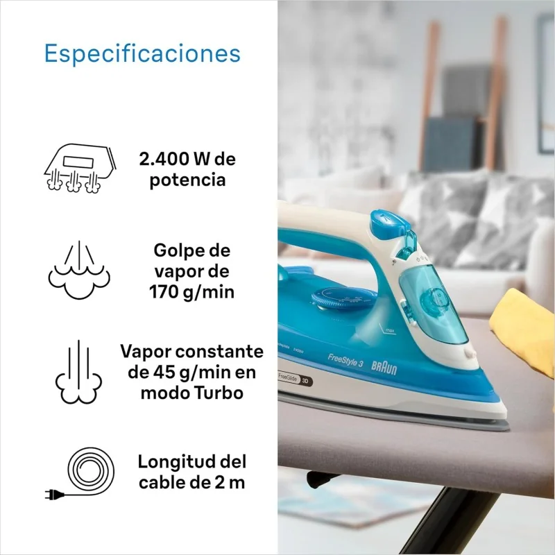 Braun FreeStyle 3 FI3144BL Fer à repasser à vapeur avec technologie FreeGlide 3D, semelle SuperCeramic, Ultimate FastClean, réservoir 270 ml, 2400 W, Azur
