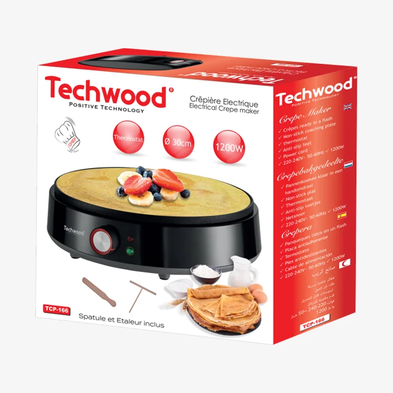 Préparez de délicieuses crêpes sucrées ou salées en toute simplicité grâce à la crêpière Techwood TCP-166. Avec sa puissance de 1200W et son thermostat réglable, elle vous garantit une cuisson rapide et parfaitement homogène. Fini les crêpes ratées ! Son large diamètre de 30 cm est idéal pour confectionner des crêpes généreuses pour toute la famille. Cette crêpière électrique a été conçue pour votre confort. Son revêtement antiadhésif assure que la pâte n'accroche pas et facilite grandement le nettoyage après utilisation. Livrée avec une spatule et un répartiteur, vous aurez tous les outils de cuisine en main pour devenir un véritable maître crêpier. C'est l'appareil de cuisson convivial par excellence pour des moments gourmands partagés.